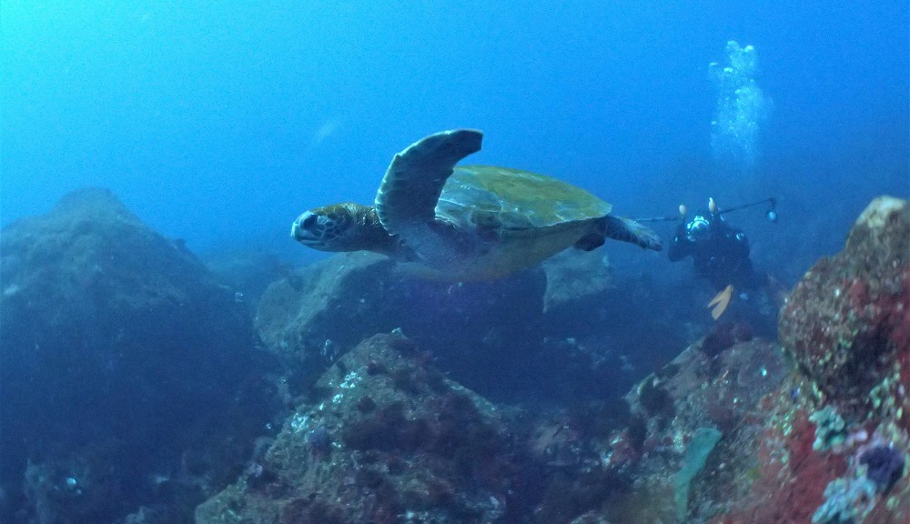 移動途中、アオウミガメがエサを食べている場面に遭遇