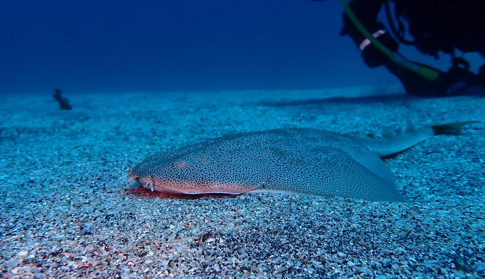 砂地には小さなカスザメ幼魚