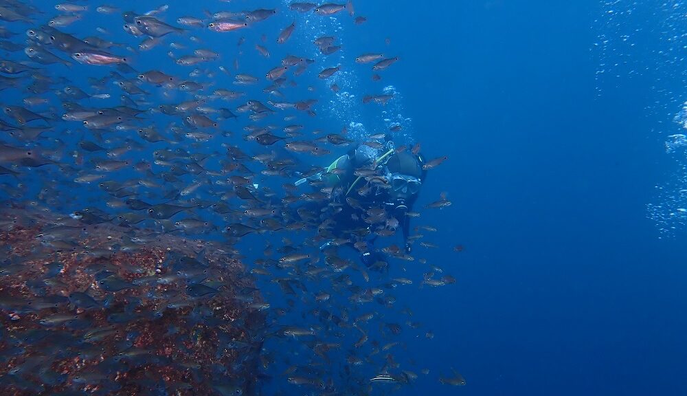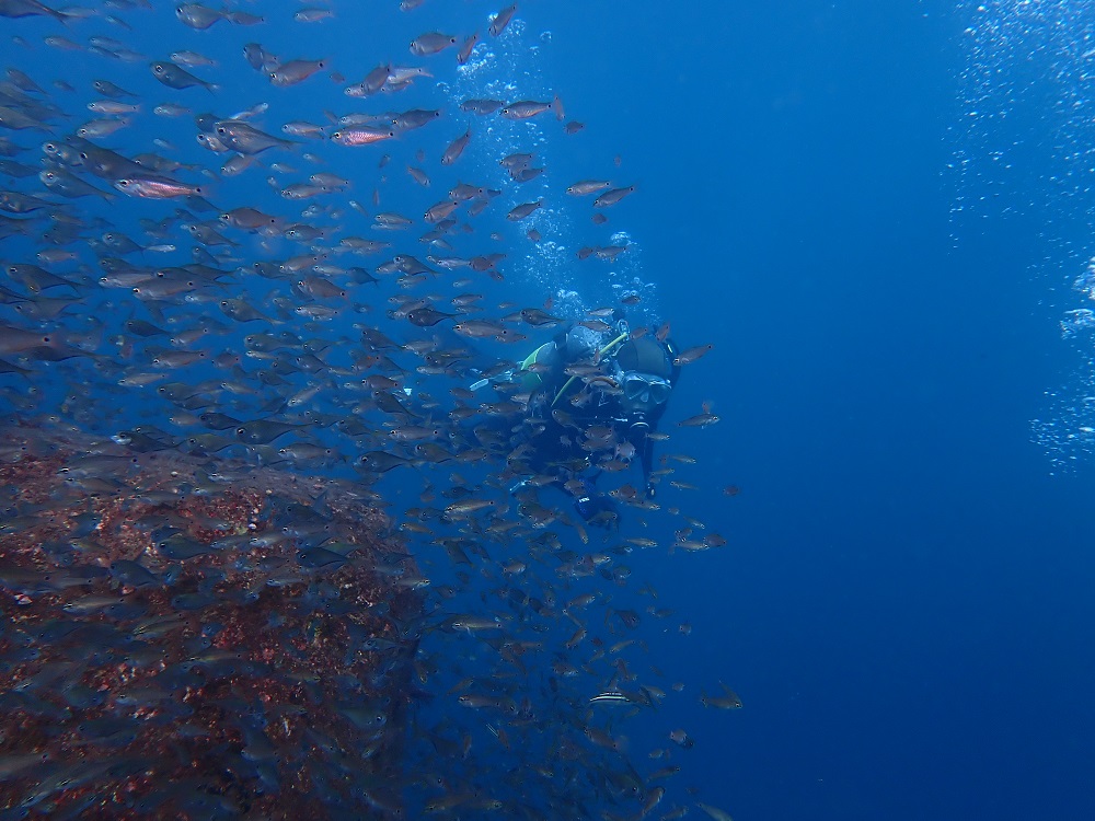 ダイビングコンディション 10月30日(木)八幡野・海洋情報 2025年10月30日 p-fish Check 10月30日(木)ポイント:八幡野天気:晴れ 気温:18℃ 水温:22~23℃透視度:5~12m 海洋状況:うねりあり 連日続く北東からの強い風本日も荒れたコンディションの為八幡野で潜ってきました。ややうねりはありましたがエントリー口は問題なく透視度は良好 本日からアドバンス講習コンパスの使い方を陸でシュミレーションした後水中でナビゲーション苦戦したところもありましたが無事、習得クロホシイシモチ、ミナミハタンポが浅場に群れ講習中も楽しめました。 アドバンス講習中