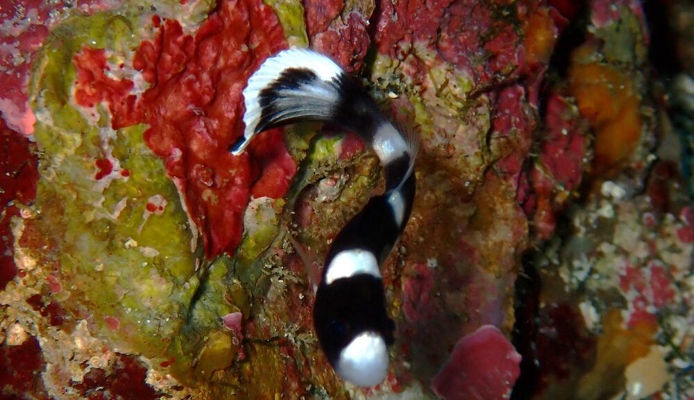ハタタテハゼのペア、近くにソメワケヤッコ幼魚