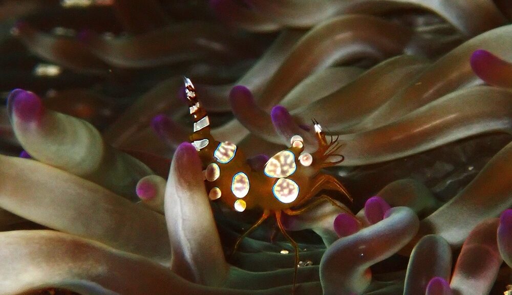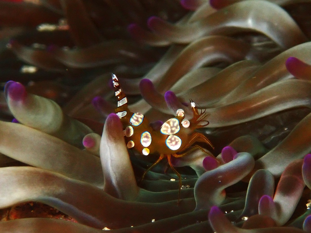 スナイソギンチャクの中にハクセンアカホシカクレエビ